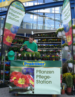 Zu den Aufgaben der Serviceteams gehört neben der Platzierung der frühmorgens frisch in speziellen Pflanzencontainern angelieferten Freilandpflanzen im Markt das regelmäßige Wässern – angepasst an die jeweilige Pflanzenart, Jahreszeit und Lufttemperatur. Auch die Pflege der Pflanzen, also das Entfernen von verwelkten Blättern und Blüten, und die Zustandskontrolle gehören dazu. Zur Pflege zählt außerdem das Wiederauffüllen leerer Container oder Flächen mit neuen Pflanzen. Von der Tätigkeit der „Pflanzenpfleger“ können sich Kunden jederzeit persönlich ein Bild machen: Sie können den Mitarbeitern bei der Arbeit über die Schulter schauen. Außerdem gibt ein Pflegenachweisschild an jedem Container Aufschluss über den Anliefertag und die täglichen Pflegemaßnahmen.