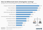Ein gutes Verhältnis zu den Kollegen und die Vereinbarkeit von Beruf und Privatleben – das sind die Hauptkriterien von Millennials bei der Entscheidung für einen Arbeitgeber. Eine gute Bezahlung ist nur für knapp 40 Prozent der Befragten entscheidend. Wichtiger sind hingegen Karriere- und Weiterbildungsmöglichkeiten, wie die Grafik von Statista zeigt. Befragt wurden für die Kienbaum-Studie 270 Studenten mit einem Durchschnittsalter von 26 Jahren.