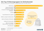 Die mit Abstand stärksten Warengruppen im E-Commerce sind "Bekleidung" (11,8 Milliarden Euro) und "Elektronikartikel & Telekommunikation" (9,9 Milliarden Euro), die zusammen für 37 Prozent des Gesamtumsatzes stehen. Auch die Warengruppe DIY und Blumen landet in den Top-Ten auf Platz 10.