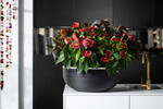 Rote, weiße und grüne Anthurien eignen sich ausgezeichnet für frische, moderne Dezemberarrangements. Präsentieren Sie die Pflanzen mit weihnachtlichen Deko-Elementen, bleiben Sie dabei gradlinig und modern: schwarze, glänzende Töpfe, Silber und Gold. Die Fülle an Stielen und Blütenständen kommt am besten zur Geltung, wenn die Pflanzen frei stehen. Anthurien haben schöne, dicke Wurzeln, die dem Erscheinungsbild der Pflanzen in einem gläsernen Topf oder einer Vase einen Mehrwert verleihen. Kleine Topfgrößen können in Torfmoos eingewickelt werden (Kokedama), um als alternative Weihnachtkugel auf einem Teller oder in einer Schale zu glänzen. Nach Weihnachten sind dann Pastelltöne angesagt.