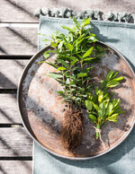 Der Lorbeer blüht weiß und bleibt ganzjährig grün. Die Pflanze ist auch als platzsparendes Formgehölz erhältlich und die passende Pflanze für alle, die nur begrenzten Platz auf dem Balkon haben. Er ist sogar als grüne Hecke bzw. Sichtschutz geeignet. Und die Blätter duften und finden auch in der Küche Verwendung.