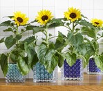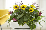Die Sonnenblume wächst als Zimmerpflanze nicht so hoch wie im Garten, aber sie hat auch diese einzigartigen, fröhlichen Blüten und das dunkle Herz einer echten Sonnenblume. Topfsonnenblumen wurden so gezüchtet, dass sie keinen Blütenstaub abgeben. Ein paar Sonnenblumen in einem Kasten oder in einer Gruppe vermitteln das Gefühl eines blühenden Feldes. Ein Hauch Lila oder Violett passt dazu, um das ganze Gelb optisch etwas abzukühlen.