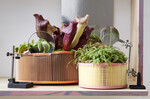 Die größeren Exemplare kommen in ihrem eigenen Übertopf besser zurecht, können aber – in Gruppen präsentiert – ein interessantes Bild abgeben. Nepenthes ist eine echte Solistin, die am besten frei hängen kann, um ihre spektakulären Kannen ins rechte Licht zu rücken. Die urige Ausstrahlung der Pflanzen bildet einen schönen Kontrast zu modernen, geometrischen Ziertöpfen. Für eine besonders natürlich wirkende Präsentation kann der Tisch darunter mit Rinde, Steinen und Wasserpflanzen gefüllt werden.