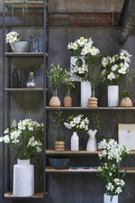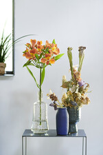 Nach dem freien, unverbindlichen Charakter des Sommers, bietet der September wieder Struktur und weckt das Bedürfnis nach Ordnung. Für das Styling der Alstroemerie bedeutet dies Ruhe und Rhythmus, um die reine Ausstrahlung der Blüte möglichst optimal zur Geltung zu bringen. Es gehört zum Zeitgeist, dass das Interesse für Nachhaltigkeit wächst, und das Verantwortungsgefühl zunimmt. Dies findet Ausdruck in der Verwendung von recycelten Gefäßen als Vasen (bemalte Flaschen), oder deren multifunktionalem Einsatz (Vasen, die auch als Krug oder Karaffe dienen können). So entsteht ein harmonisches Ganzes, in dem Übersicht herrscht. Dieser Eindruck wird von Farben unterstützt, die recht nüchtern sind, wie Weiß, Grau, Schwarz, Blau und ein Hauch Rotbraun.