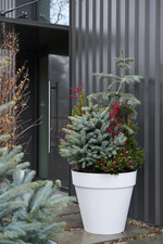 Kombinieren Sie verschiedene Arten und Größen von Fichte und Tanne, damit sich die unterschiedlichen Formen gut voneinander abheben. Die Basis kann nüchtern sein: Braun, Schwarz, Grau unterstreichen das Natürliche der Bäume und lassen sie besonders grün erscheinen. Diese Farben entsprechen auch dem Stiltrend, bei dem eine gewisse Strenge und Übersichtlichkeit im Garten wichtig sind. Im Dezember können auch die roten Gartenpflanzen vom November durch einzelne Fichten und Tannen ergänzt werden. So entsteht eine festliche Gesamtpräsentation in Richtung Weihnachten.
