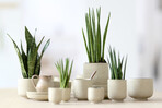 Für die Präsentation wird eine Kombination mit matten weißen oder hell naturfarbenen Töpfen empfohlen. Damit wird die Ausstrahlung der Sanseverie unterstrichen, die mit ihrer einfachen, klaren Form den Wunsch nach Natur und Ruhe erfüllt. Der Effekt wird noch stärker, wenn die Sansevieria als „Familie“ in Töpfen eines Stils präsentiert wird.
