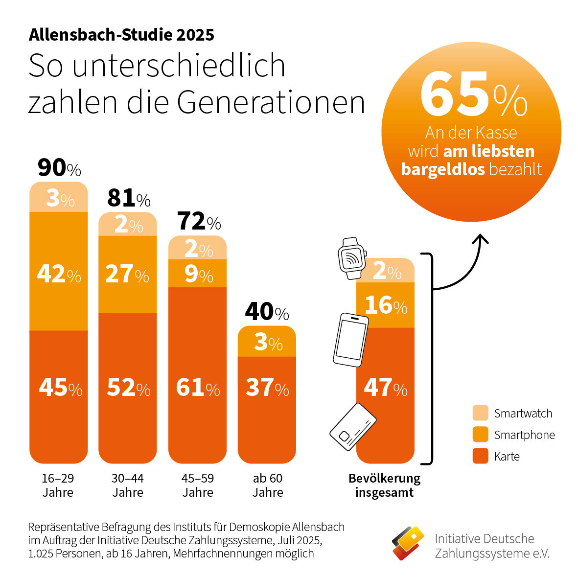 von Initiative Deutsche Zahlungssysteme/Redaktion erschienen am 31.10.20252006 ließ die Initiative erstmals eine umfassende Allensbach-Studie zum Bezahlverhalten durchführen – seitdem erfolgt die Erhebung jährlich. In diesem Jahr hat dabei die Kartenzahlung zum ersten Mal die Barzahlung überholt. 47 Prozent der Befragten gaben an, bei ihrem letzten Einkauf mit Karte bezahlt zu haben (2024: 44 Prozent). Zahlungen mit Scheinen oder Münzen folgten dicht dahinter mit 41 Prozent (2024: 48 Prozent). Unter den Personen, die verschiedene Bezahlkarten besitzen, nutzt über die Hälfte (52 Prozent) am liebsten ihre girocard, während 15 Prozent die Kreditkarte bevorzugen. Auch ein Blick in die Zukunft zeigt: Im Jahr 2030 prognostizieren 77 Prozent der Befragten, dass die Debitkarte der deutschen Banken und Sparkassen weiterhin das meistgenutzte Zahlungsmittel bleibt.