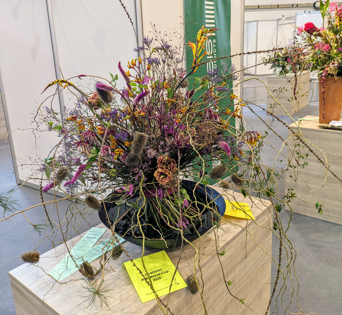 von Redaktion erschienen am 05.02.2026Der IPM Messe-Cup ist mittlerweile ein fester Bestandteil der IPM Essen. In diesem Jahr stand der beliebte Wettbewerb unter dem Thema „Wo Natur keine Grenzen kennt“. Unter dem Motto „Grenzenlos blühende Gemeinschaft“ präsentierten die Teilnehmenden ihr Können in den Kategorien „Strauß“, „Grüner Held im Topf“ und „Gefäßpflanzung“. Die Initiatoren des Wettbewerbs durften sich in diesem Jahr über 81 Teilnehmende freuen, das ist erneut eine Steigerung gegenüber dem Vorjahr, in dem es knapp 50 Einreichungen gegeben hatte.