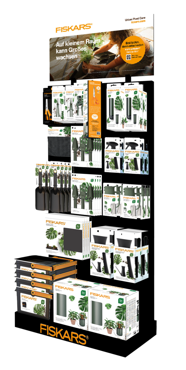 Ideal ist die Platzierung im Bereich der Topf- und Zimmerpflanzen. Stadt- und Indoorgärtner greifen genau dann zu Werkzeugen, wenn sie umtopfen, neue Pflanzen kaufen, Gemüse ziehen oder Schädlinge bekämpfen möchten. Fiskars bietet hierfür eine breite Auswahl an aufmerksamkeitsstarken POS-Materialien sowie eine digitale Toolbox, die Handelspartner für eigene Werbemaßnahmen nutzen können.