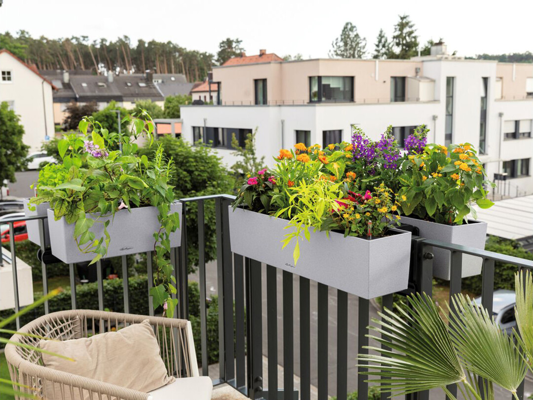 Der Balkonkasten setzt farbenfrohe Blüten, mediterrane Kräuter und urbane Gemüsegärten gleichermaßen in Szene. Die verschiedenen Farben und Oberflächen eröffnen zusätzliche Gestaltungsräume: So verbreitet BALCONERA Cottage mit seiner Flechtstruktur Landhausflair, die seidenmatte Oberfläche von BALCONERA Color ist vielseitig kombinierbar und BALCONERA Stone in Stein-Optik sorgt für natürliche Strukturen. Zwei kompakte Größen (40 und 50 cm) eignen sich ideal für schmale Balkone, während die Varianten mit 80 und 100 cm an langen Geländern zur Geltung kommen.