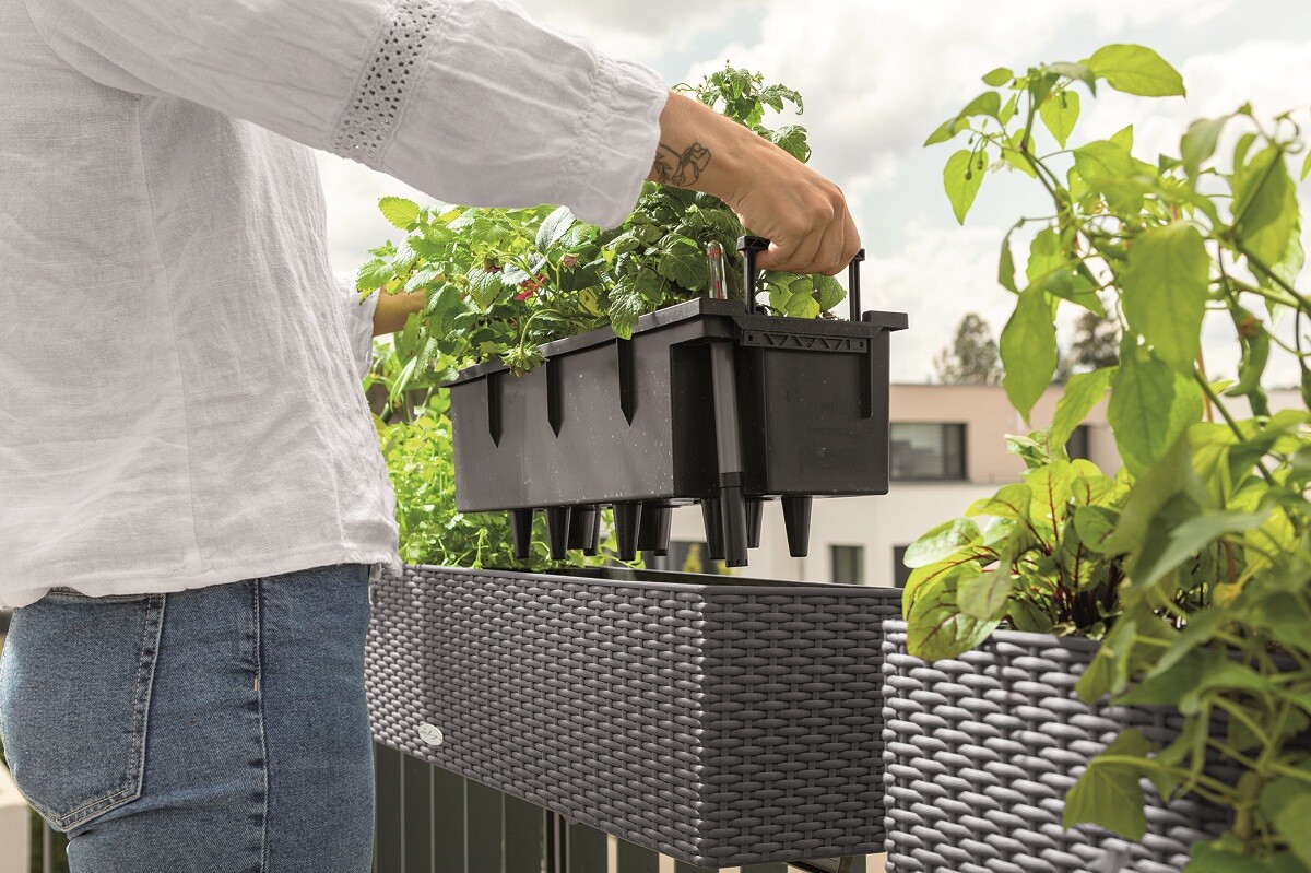 Für maximalen Komfort beim Bepflanzen besitzt BALCONERA bis zu zwei herausnehmbare Pflanzeinsätze. Sie lassen sich bequem auf dem Tisch vorbereiten, während das Gefäß am Balkongeländer befestigt bleibt. Die Einsätze sind untereinander kompatibel (40 mit 80 cm bzw. 50 mit 100 cm) und können einfach getauscht werden, zum Beispiel für saisonale Bepflanzung.
