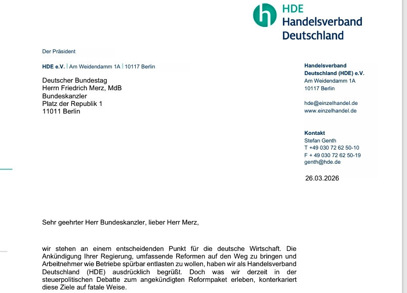 In einem Brief an Bundeskanzler Merz und Vizekanzler Klingbeil fordert der HDE eindringlich, die Debatte um eine mögliche Mehrwertsteuererhöhung umgehend zu beenden. „In der aktuellen konjunkturellen Lage ist eine Erhöhung der Mehrwertsteuer wirtschaftspolitischer Irrsinn!“, mahnt HDE-Präsident Alexander von Preen.