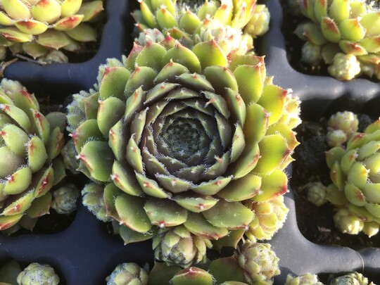 Green volcan zeigt eine grüne, leicht behaarte Rosette mit schwarzem Blattpunkt und Ausläufern. Die Blätter der Hauptpflanze sind spiralförmig angeordnet.