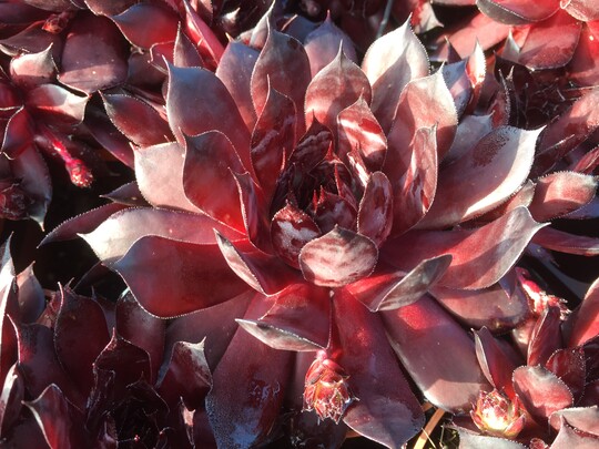 Bei Darkona besticht vor allem die braun-schwarz glänzende Rosette. Ihre länglichen Blätter enden stark spitzenförmig.