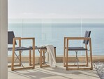 Neue Perspektiven für die Komfortzone auf der Seeterrasse: Hier wird Teakholz unkonventionell in Szene gesetzt. Im Design der Armlehnstühle sind behagliche Polster bereits integriert. Edelstahl spielt eine tragende Rolle. Und die Sommersonne rückt alles ins rechte Licht.