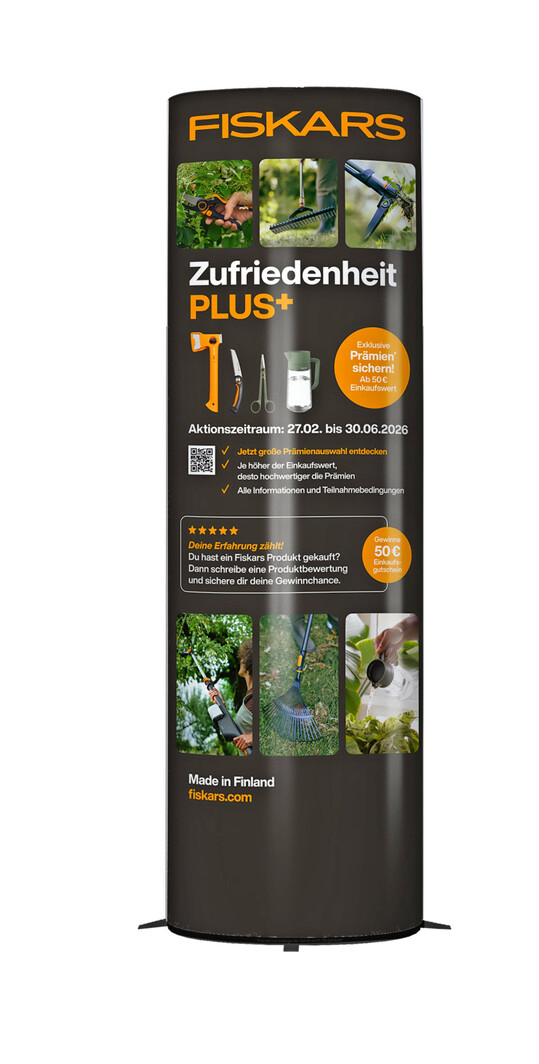 Im Zeitraum vom 27. Februar bis 30. Juni 2026 ergänzt Fiskars die bestehende Garantie um die Aktion „Zufriedenheit PLUS+“. Kundinnen und Kunden, die Produkte im Wert von mindestens 50 Euro erwerben, diese innerhalb der 30-Tage-Frist behalten und ihren Kassenbon hochladen, erhalten eine Wunschprämie. Mit steigendem Einkaufswert erhöht sich die Wertigkeit der auswählbaren Prämien; eine Mehrfachteilnahme mit unterschiedlichen Einkaufsbelegen ist möglich.