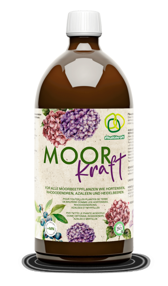 Moorbeetpflanzen wie Hortensien oder Heidelbeeren bringen ein besonderes Flair in jeden Garten, stellen aber auch hohe Ansprüche. Sie wachsen in sauren Böden, die in unseren Regionen eher selten sind. Sie brauchen meist aufwendig vorbereitete Beete – sind sie zu basisch oder die Pflanzen nicht ausreichend mit Nährstoffen versorgt, verkümmern sie letztendlich. Mit MoorKraft bringt Multikraft nun ein biozertifiziertes Kombi-Produkt auf den Markt, das dank probiotischer Wirkung das Phytobiom (Mikrobiom der Pflanze) stärkt und zugleich das wichtige Spurenelement Mangan liefert – für kräftige Pflanzen, leuchtende Blüten und reiche Ernten bei weniger Aufwand.