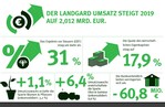 Landgard hat im Jahr 2019 eine Umsatzsteigerung um 3 % auf jetzt 2,012 Mrd. Euro (Vorjahr 1,953 Mrd. Euro) erzielt. Davon entfielen 1,225 Mrd. Euro (Vorjahr 1,212 Mrd. Euro) auf die Sparte Blumen & Pflanzen und 761 Mio. Euro (Vorjahr 715 Mio. Euro) auf die Sparte Obst & Gemüse.