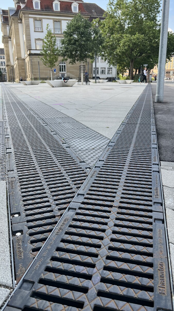 In Zusammenarbeit mit den Projektpartnern bau+grün und Bauer Landschaftsarchitekten wurden in der Gesamtlösung diverse Rinnenstränge eingeplant, die das gesammelte Wasser um Gebäude und Platz herum zu den umliegenden Grünflächen führen. Thorin Oesterle: „Sie fungieren als Rückhaltebecken und Versickerungsmulden.“