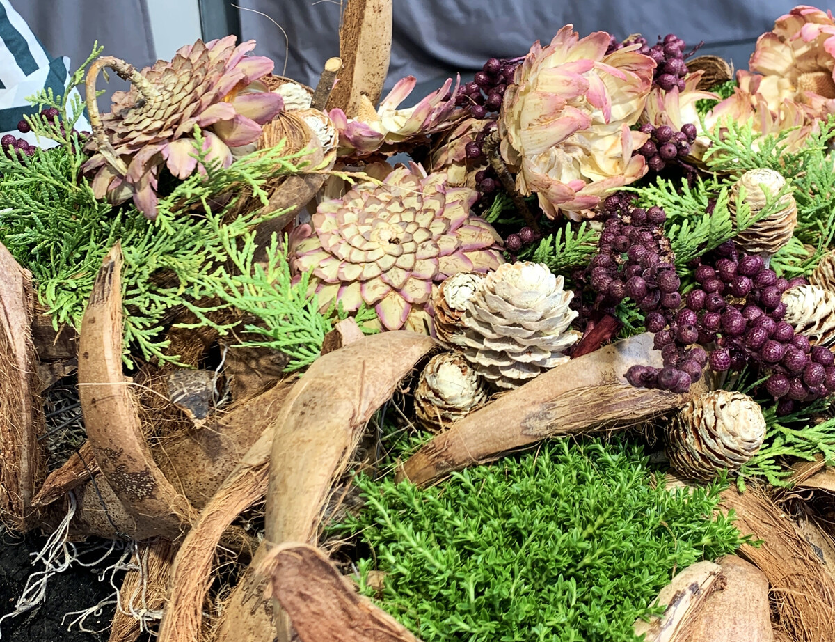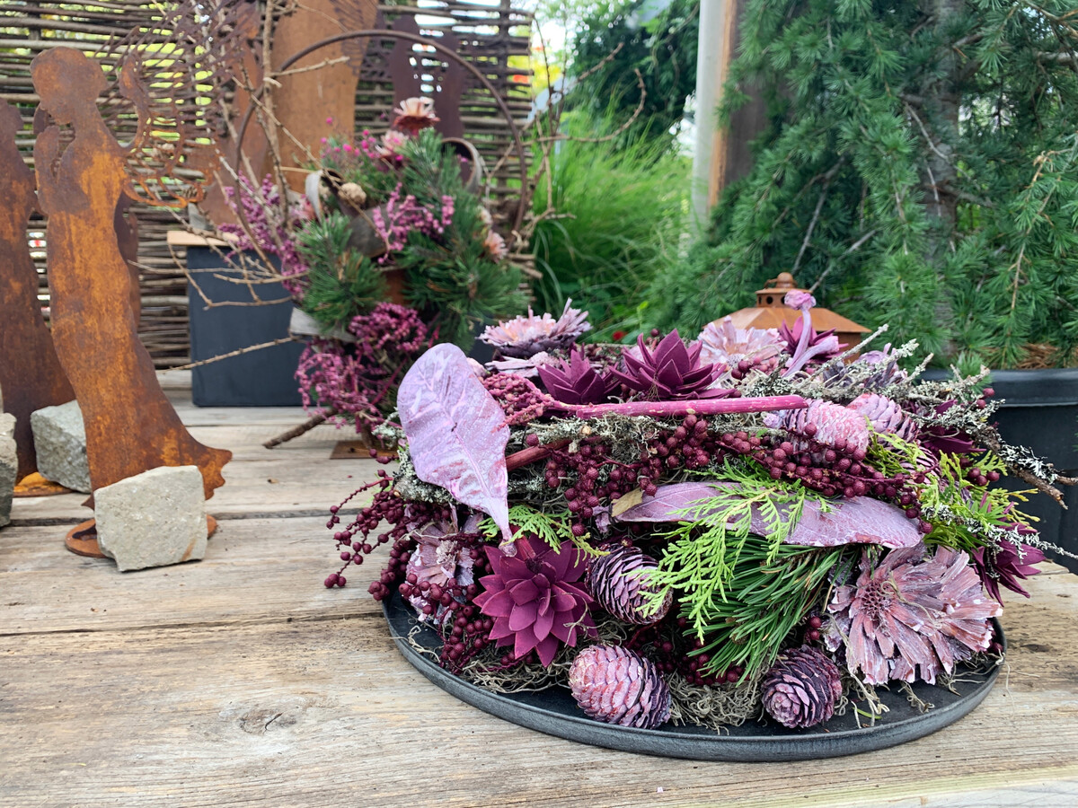 Martina Gremer lobte die enorme Auswahl an Exoten bei Trautz und erläuterte ihre Ideen bei der Verarbeitung. Die gemischten Kartons, die unterschiedliche Materialien in einer Farbe beinhalten, reichen oft für fünf bis sechs Werkstücke. Proteen in Beerenfarben verarbeitet Martina Gremer auch mal mit der Unterseite nach oben. Bei Serien kleiner Werkstücke, die zum Beispiel für Urnengräber nachgefragt werden, empfiehlt Josef Dir die Präsentation in Gruppen, idealerweise auf einem großen Tablett.