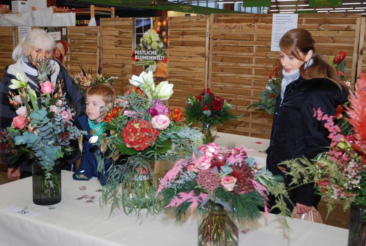 Eingeladen waren Kundinnen und Kunden des Blumengroßmarkts, zwei Sträuße pro Betrieb waren zugelassen. Gefordert waren ein Verkaufspreis von 75 Euro und eine adventliche Anmutung – gedacht als Geschenk für besondere Anlässe. Jeder Strauß wurde mit einem Startgeld in Form eines 60-Euro-Einkaufsgutscheins unterstützt. Insgesamt 22 Wettbewerbssträuße stellten sich den Blicken des Fachpublikums.