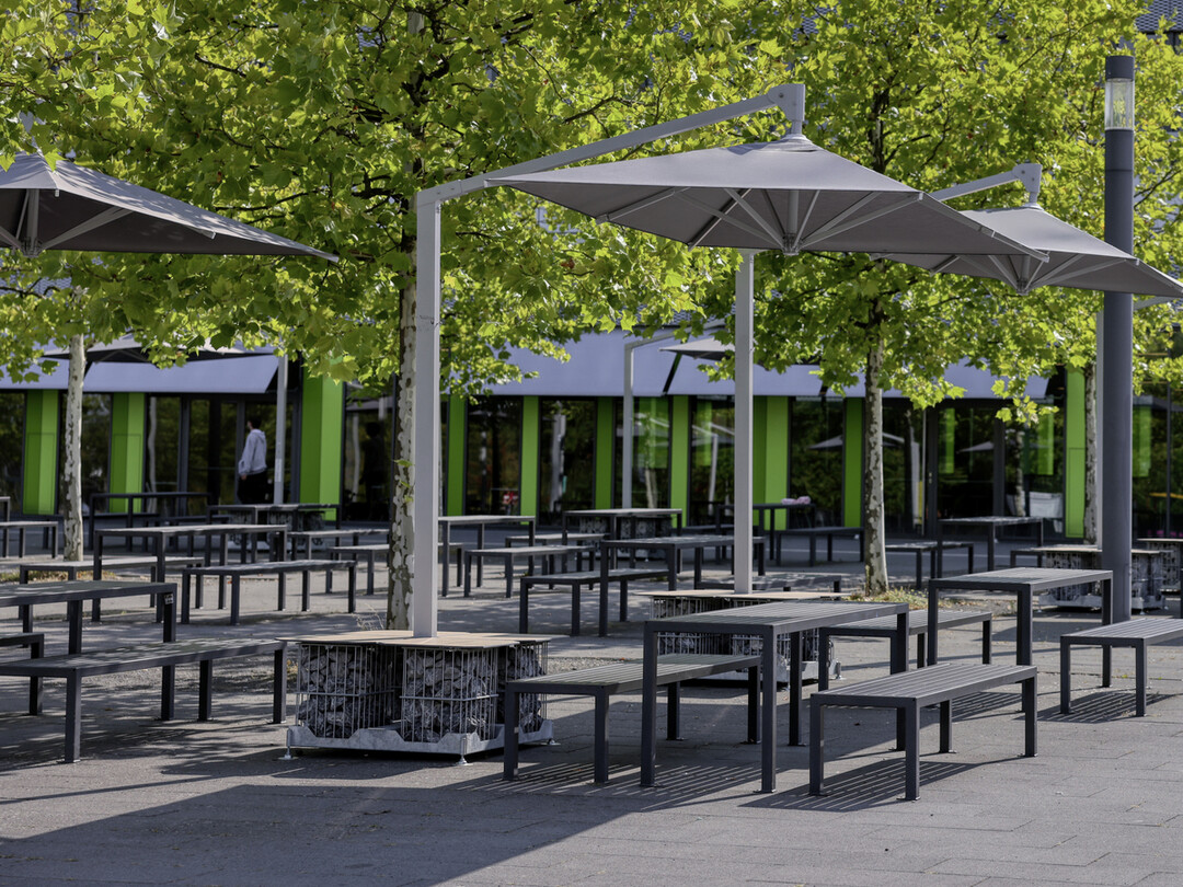 Bei der Neugestaltung des Mensavorplatzes der Uni Bielefeld wurden die Aufenthaltsbereiche aufgewertet. Für optimalen Sonnen- und Witterungsschutz sorgen flexible & langlebige Ampelschirme von Caravita – eine Lösung, die Designanspruch, Funktionalität & Technik verbindet.