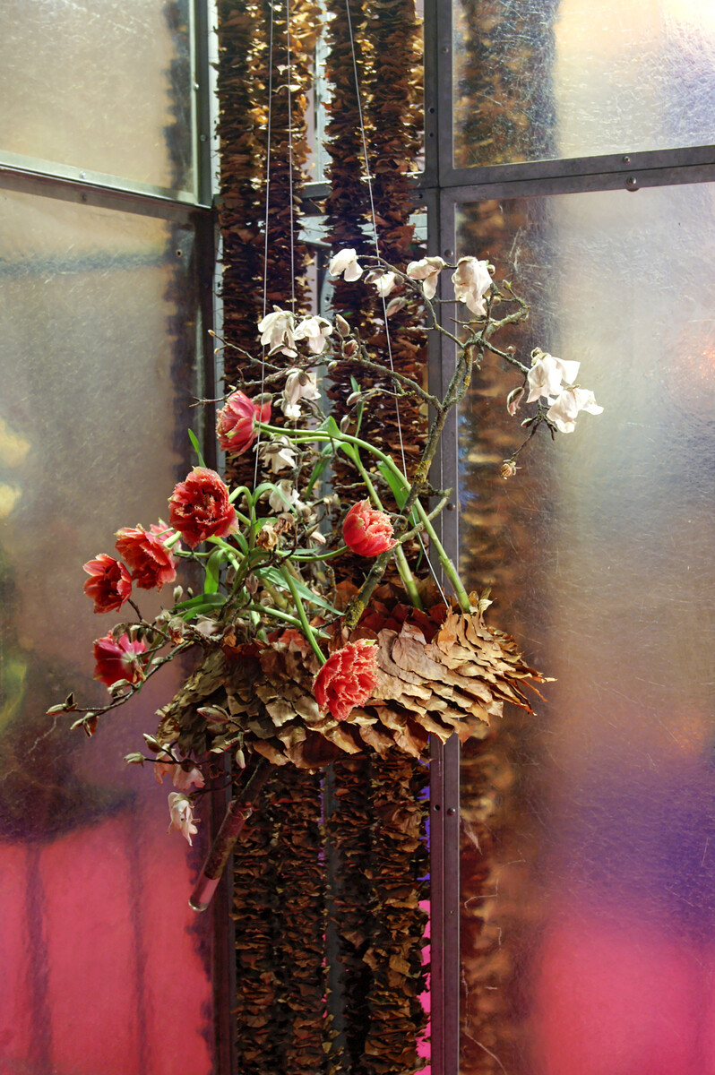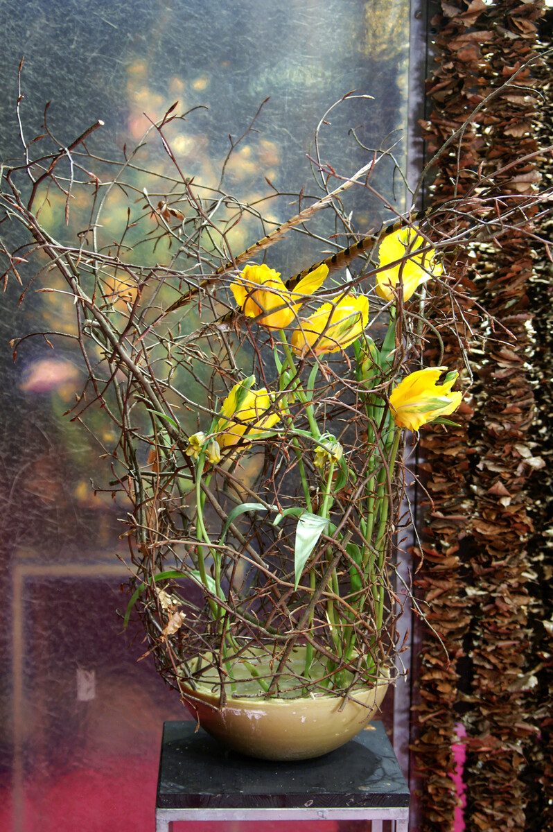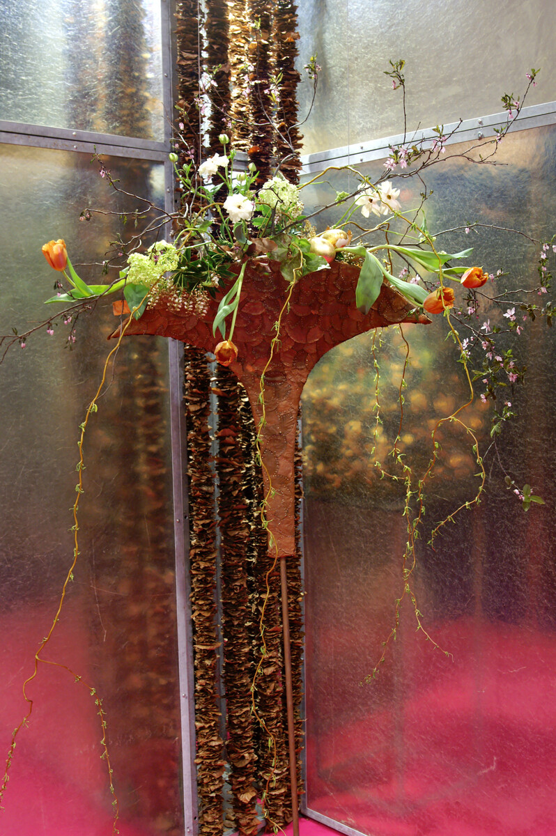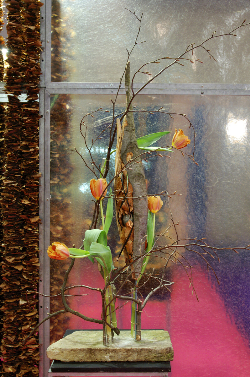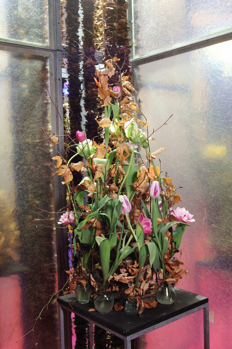 Begleitet wurde die florale Leichtigkeit der Tulpen von einem Werkstoff, der auf den ersten Blick ungewöhnlich erscheint: Buche in all ihren Erscheinungsformen. Stamm, Ast, Zweig und Blatt bildeten den gestalterischen Gegenpol zur Frische der Blüten. Die Entscheidung für dieses „Trockene–Vergangene“ fiel in einem gemeinsamen Prozess innerhalb der Gruppe. Auf die Früchte der Buche wurde bewusst verzichtet – sie hätten eine zu starke Assoziation an die Winter- und Weihnachtszeit geweckt.