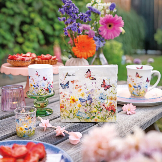 Butterflies in field zeigt ein blühendes Feld mit lebendigen Schmetterlingen in warmen und frischen Farben. Das fröhliche Design bringt Natur auf den Tisch – mit Servietten, Geschirr, Textilien, Tischtuch und dekorativem Brotkorb für eine stimmige Tafel.
