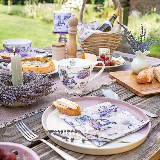 Die Serie La Provence holt den Süden Frankreichs auf den Tisch: Lavendel, Fahrräder und Roller in sanften Lilatönen erzeugen Sommerstimmung. Servietten, Geschirr, Textilien, Kissen und Accessoires schaffen ein harmonisches, komplett abgestimmtes Tischkonzept.