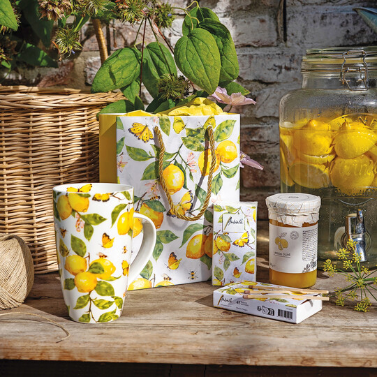 Die Kollektion Fresh Lemons von Ambiente Europe bringt Sommerfrische auf den Tisch: leuchtende Zitronen, grüne Blätter, rosa Blüten und spielerische Schmetterlinge. Servietten, Tassen, Tabletts, Textilien und neue Tischdecke komplettieren das fröhliche Design.