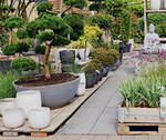 Ob ein Gemälde, eine Gartengestaltung oder eine Verkaufsfläche - Farbe ist das entscheidende Kriterium. Sie sorgt für Spannung, Emotion und Aufmerksamkeit. Die Harmonie im Zusammenspiel unterschiedlicher Grün-Nuancen oder Grau-Tönen, oder wie hier im Bild der violette Farbklecks als Akzent zu den Pflanzgefäßen - ein stimmiges Farbkonzept ist die Basis jeder Warenpräsentation. Die Holzfassade des Gebäudes fügt sich harmonisch in die Freifläche ein. Bei jeder Verkaufsfläche stellt sich die Frage: Was macht den Kunden neugierig – wohin soll er seine Schritte lenken?