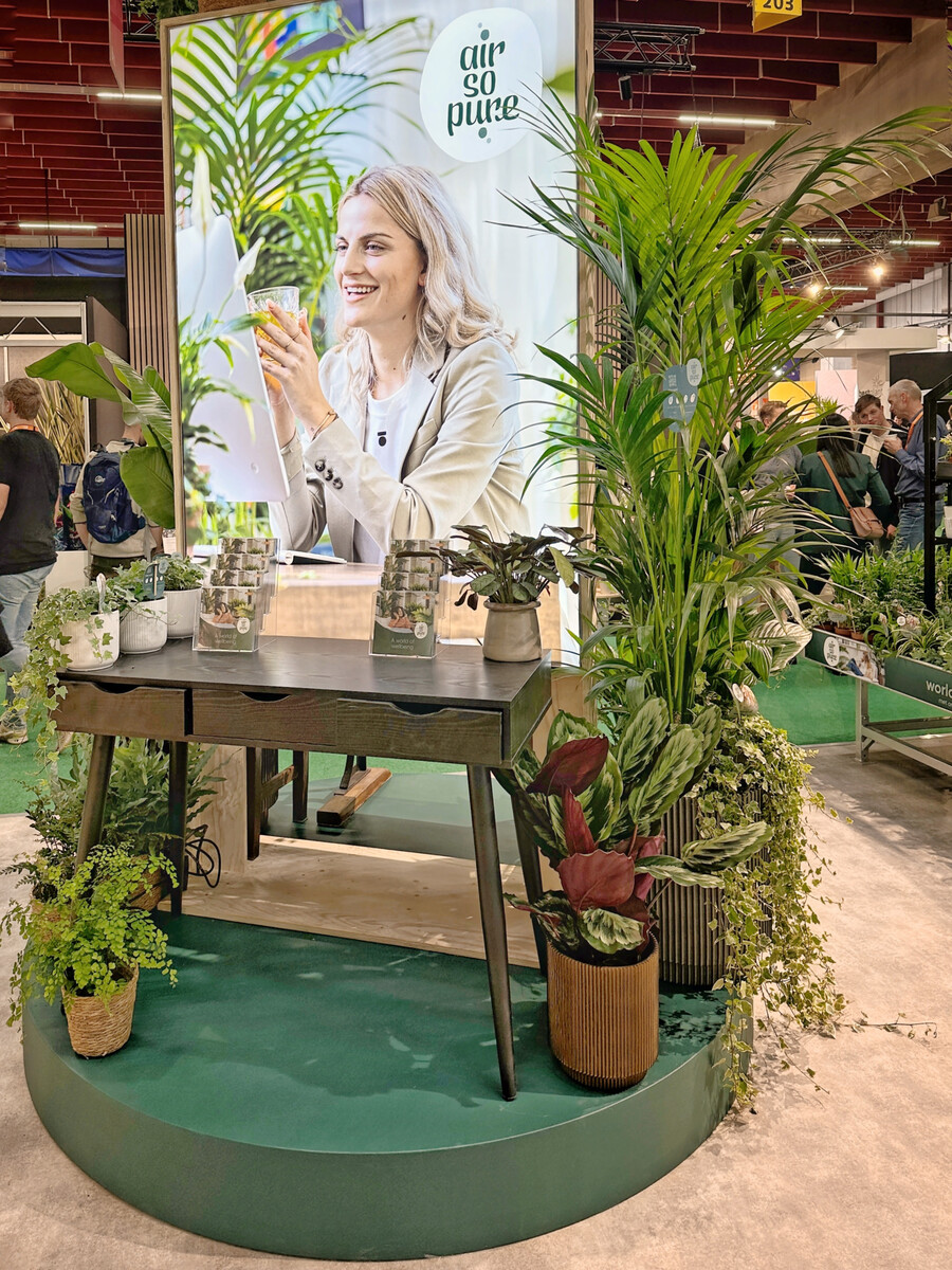 Ein Höhepunkt des Messeauftritts war das neue Air So Pure-Kombimöbel, das Präsentation und Flächeneffizienz verbindet. Es kombiniert einen niedrigen Tisch mit einem hohen, metallenen Rückregal in Hausform – ein Blickfang mit Mehrwert. Händler können damit deutlich mehr Pflanzen pro Quadratmeter zeigen und gleichzeitig zusätzliche Produkte wie Übertöpfe oder Accessoires integrieren.