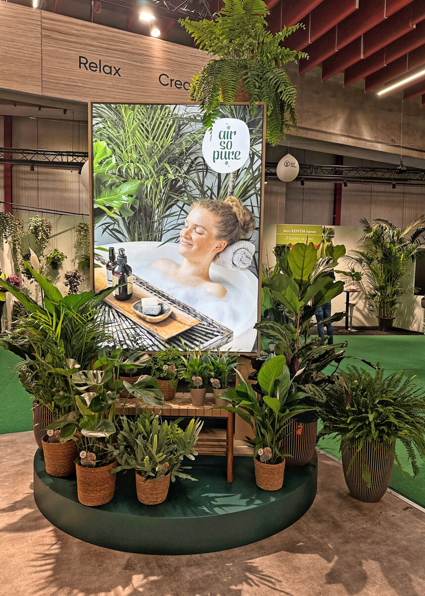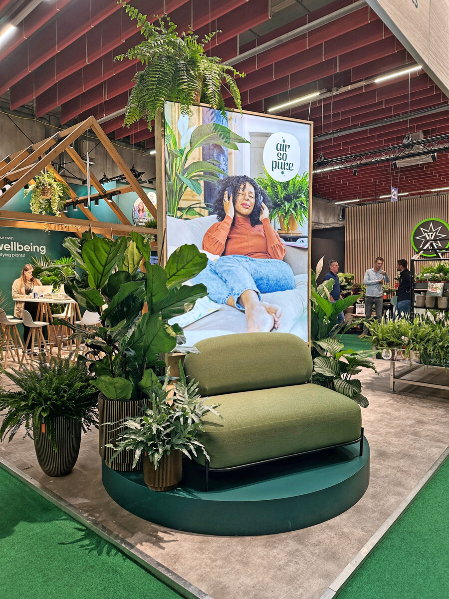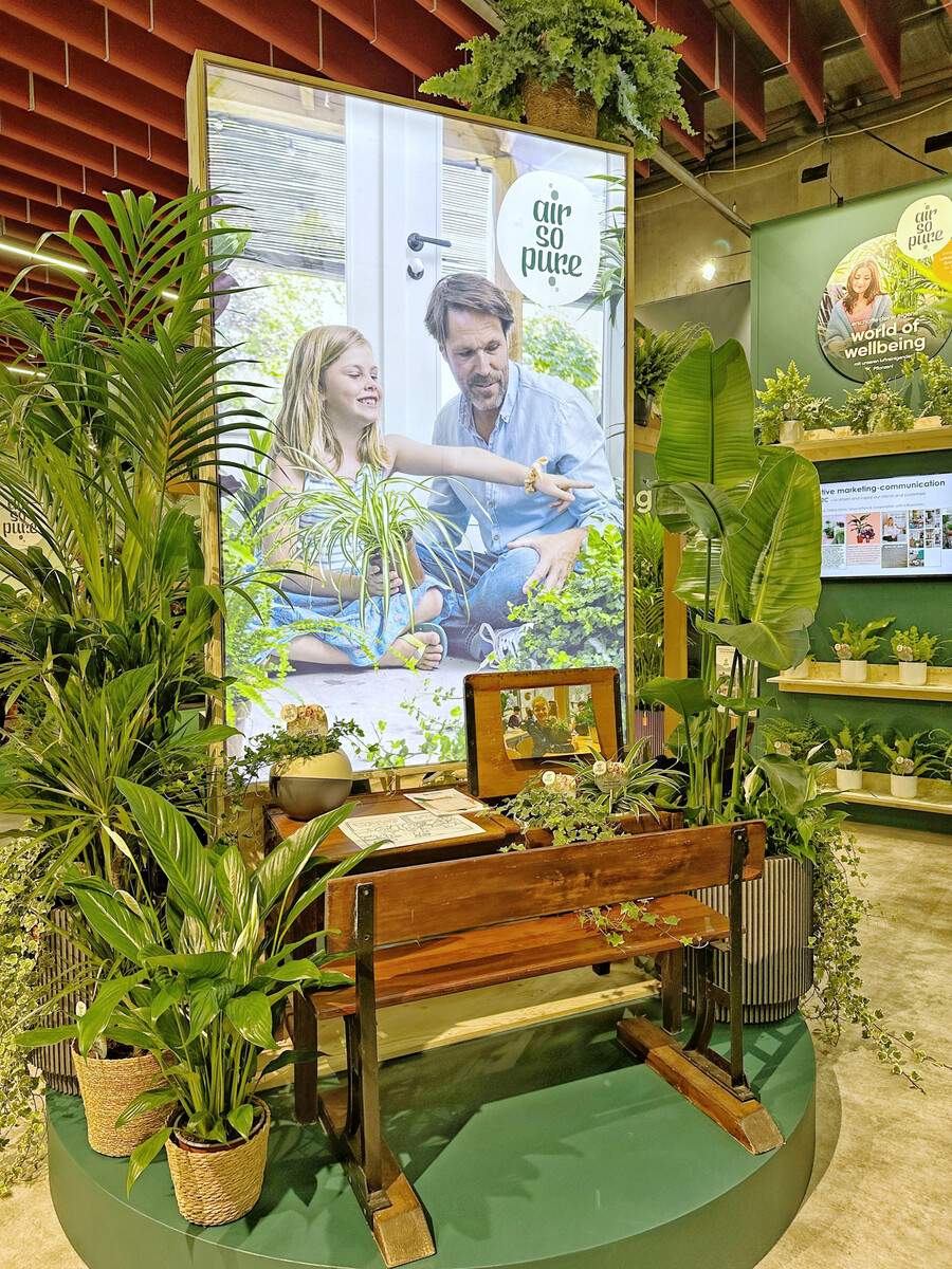 Der Messestand zeigte eindrucksvoll, wie sich Pflanzen über Lebenswelten erzählen lassen. In vier Themeninseln – Wohnen, Arbeiten, Lernen und Entspannen – inszenierte Air So Pure sein Sortiment als Teil moderner Lebensräume. Großformatige Leucht-Displays, atmosphärisch dekorierte Flächen und markante Branding-Elemente machten deutlich: Zimmerpflanzen können weit mehr sein als Dekoration – sie sind funktionale Begleiter für ein gesünderes und angenehmeres Raumklima.